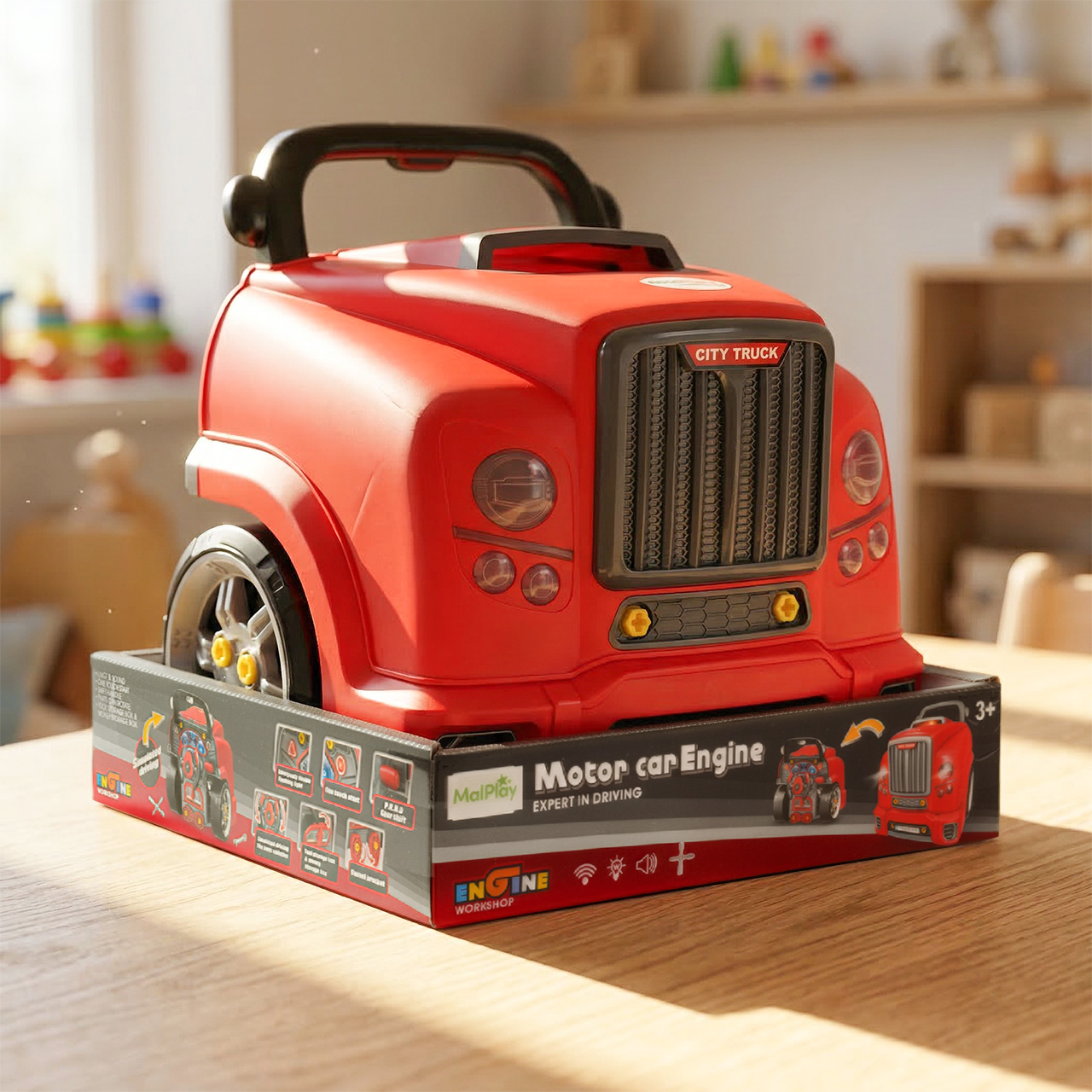 To nie jest mała zabawka, którą dziecko odłoży po 5 minutach. Duży rozmiar sprawia, że silnik prezentuje się efektownie i od razu przyciąga uwagę. Dzięki temu maluch może poczuć się jak prawdziwy mechanik, który pracuje przy dużym aucie.