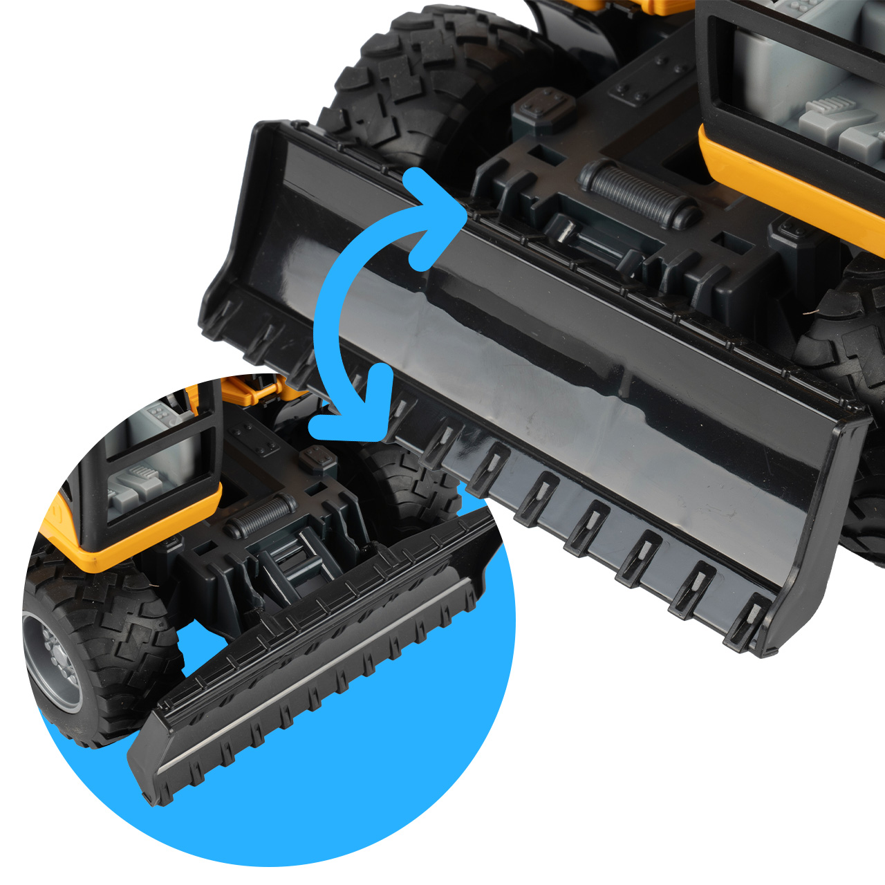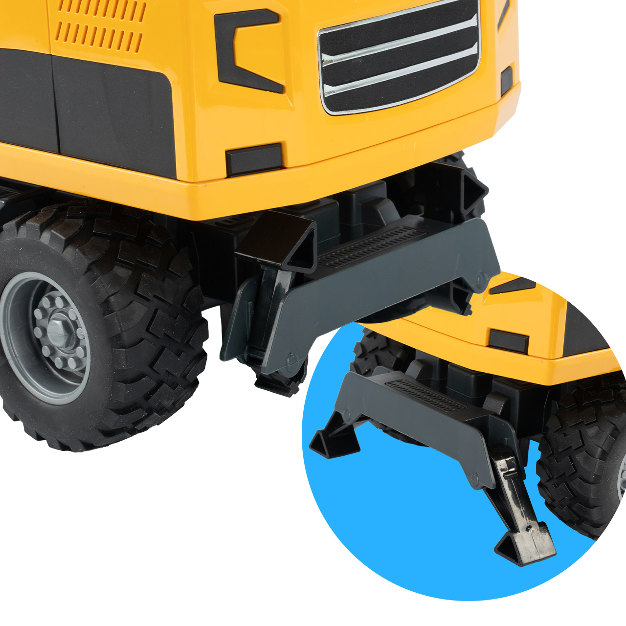 Přední radlice a stabilizační opěry dodávají hračce realismus a bagr vypadá jako skutečný stavební stroj . To dětem umožňuje ještě efektivněji reprodukovat scény ze staveniště, nakládání a zemní práce. Detaily, jako jsou tyto, mají obrovský význam, protože vytvářejí iluzi skutečného stroje.
