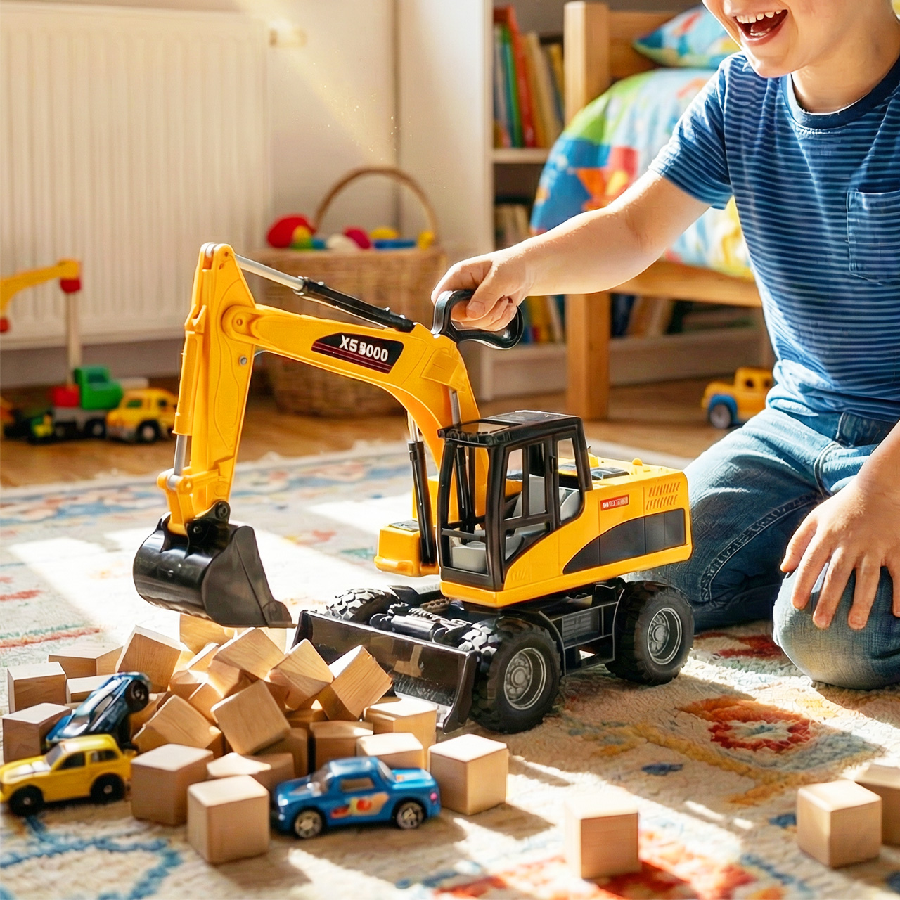 Bagr byl navržen tak, aby byl dynamičtější a realističtější. Otočné tělo umožňuje měnit směr stroje a hrát si různé stavební scénáře, aniž byste museli s celou hračkou pohybovat. Děti se tak mohou cítit, jako by ovládaly skutečný bagr, a ještě více se ponoří do zábavy.