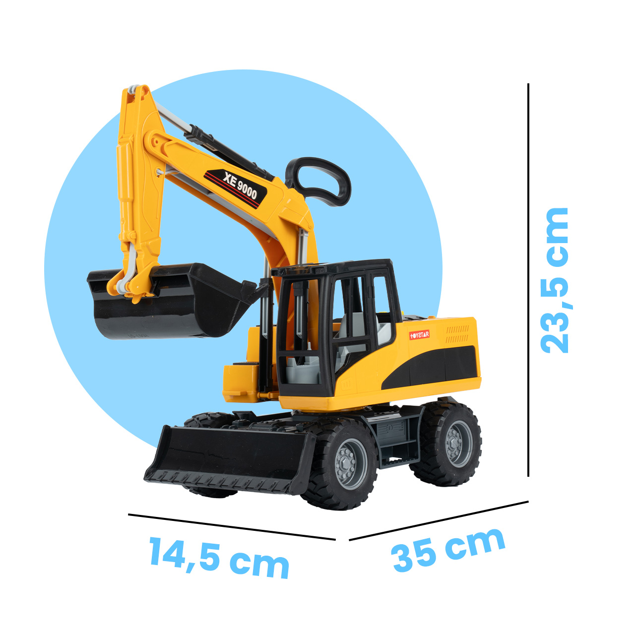 Není to malá, nenápadná hračka, ale velký bagr, který skutečně upoutá pozornost dítěte. Jeho délka přibližně 35 cm mu dodává robustní a robustní vzhled, který okamžitě vybízí ke hře. Tato velikost poskytuje lepší vizuální efekt, větší pohodlí při ovládání a mnohem více zábavy než menší modely.