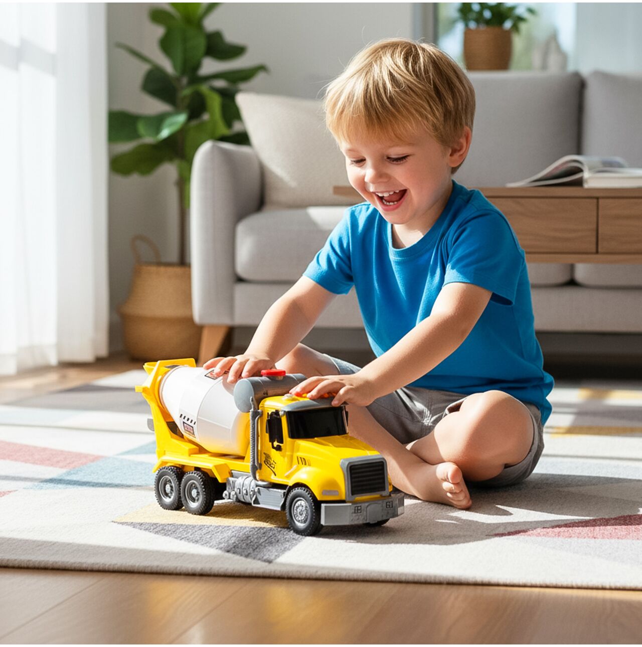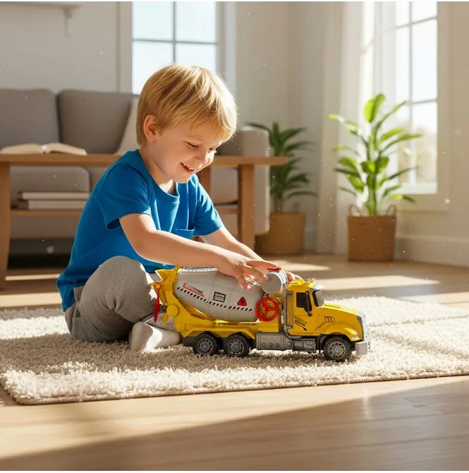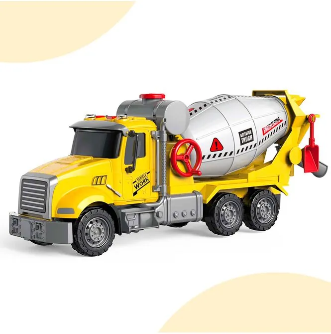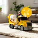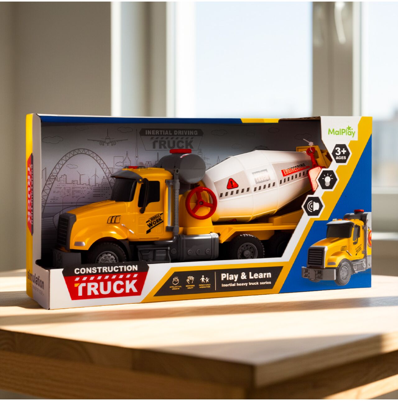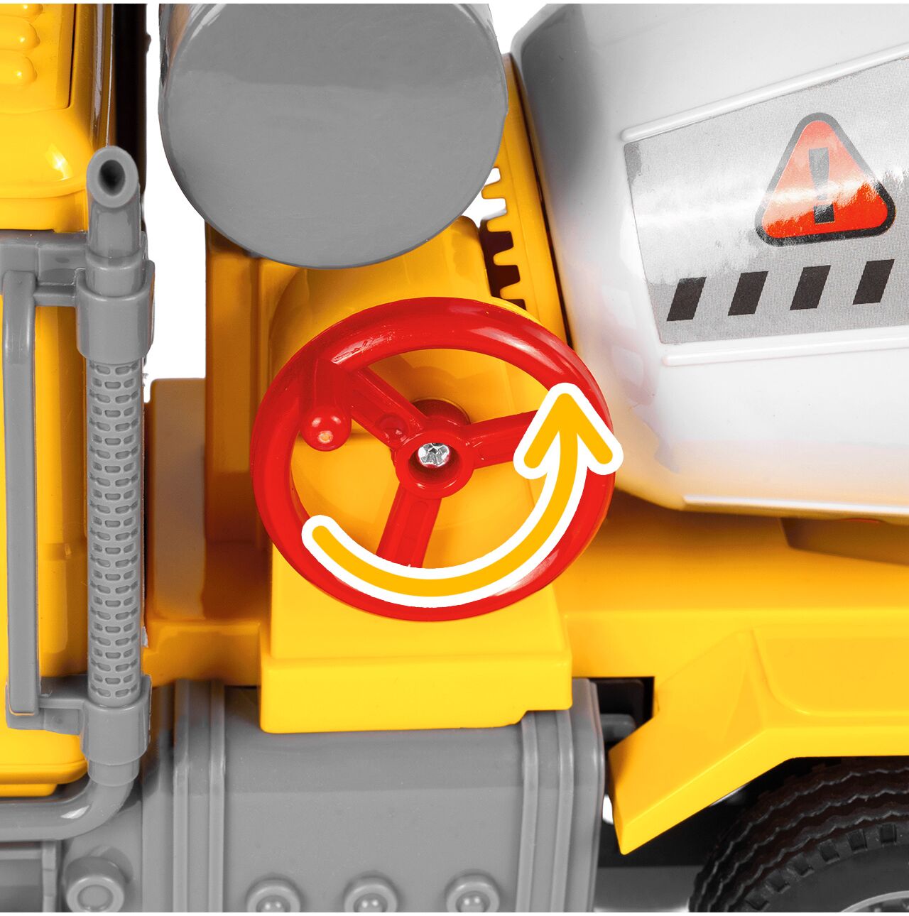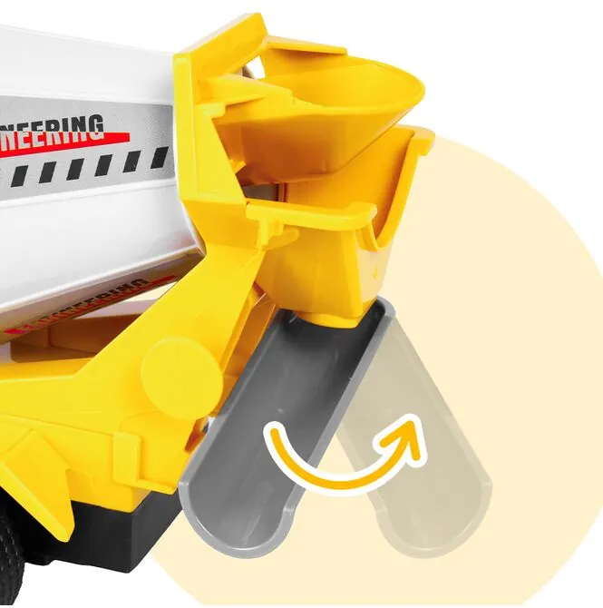 Hračka je navržena tak, aby připomínala skutečné stavební vozidlo. Buben míchačky na beton se otáčí knoflíkem a zadní násyp je pohyblivý , což umožňuje ještě více si prožít scény související se stavbou.Díky tomu dítě nejen řídí auto, ale také aktivně využívá jeho funkce.