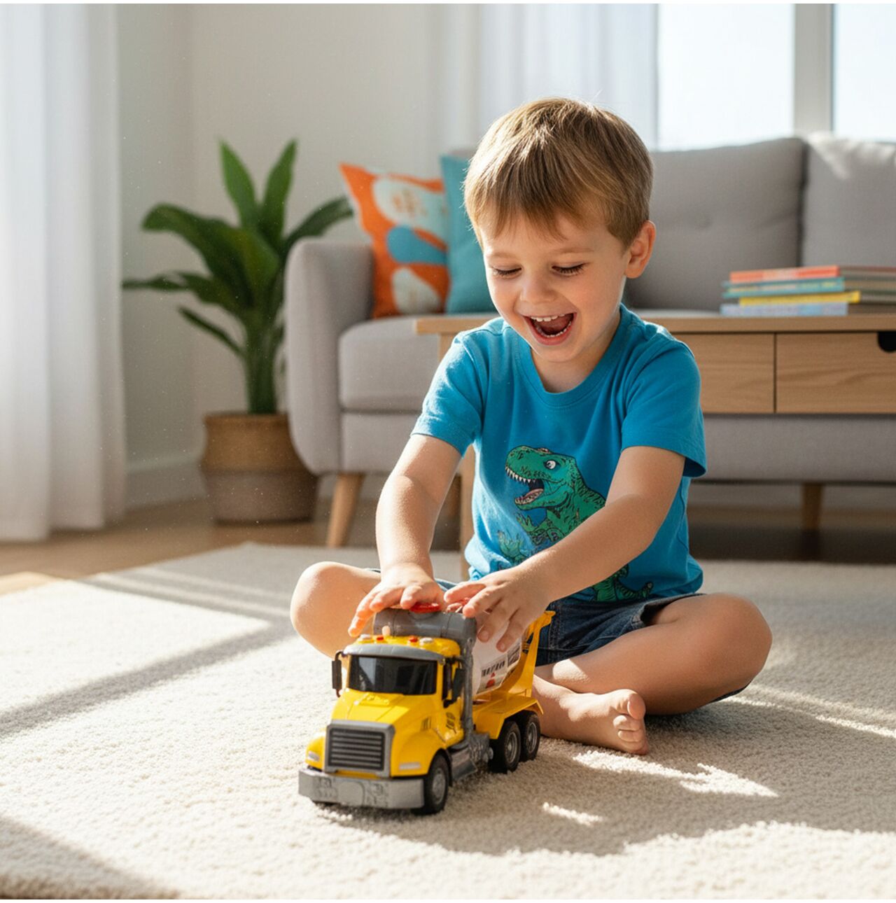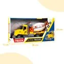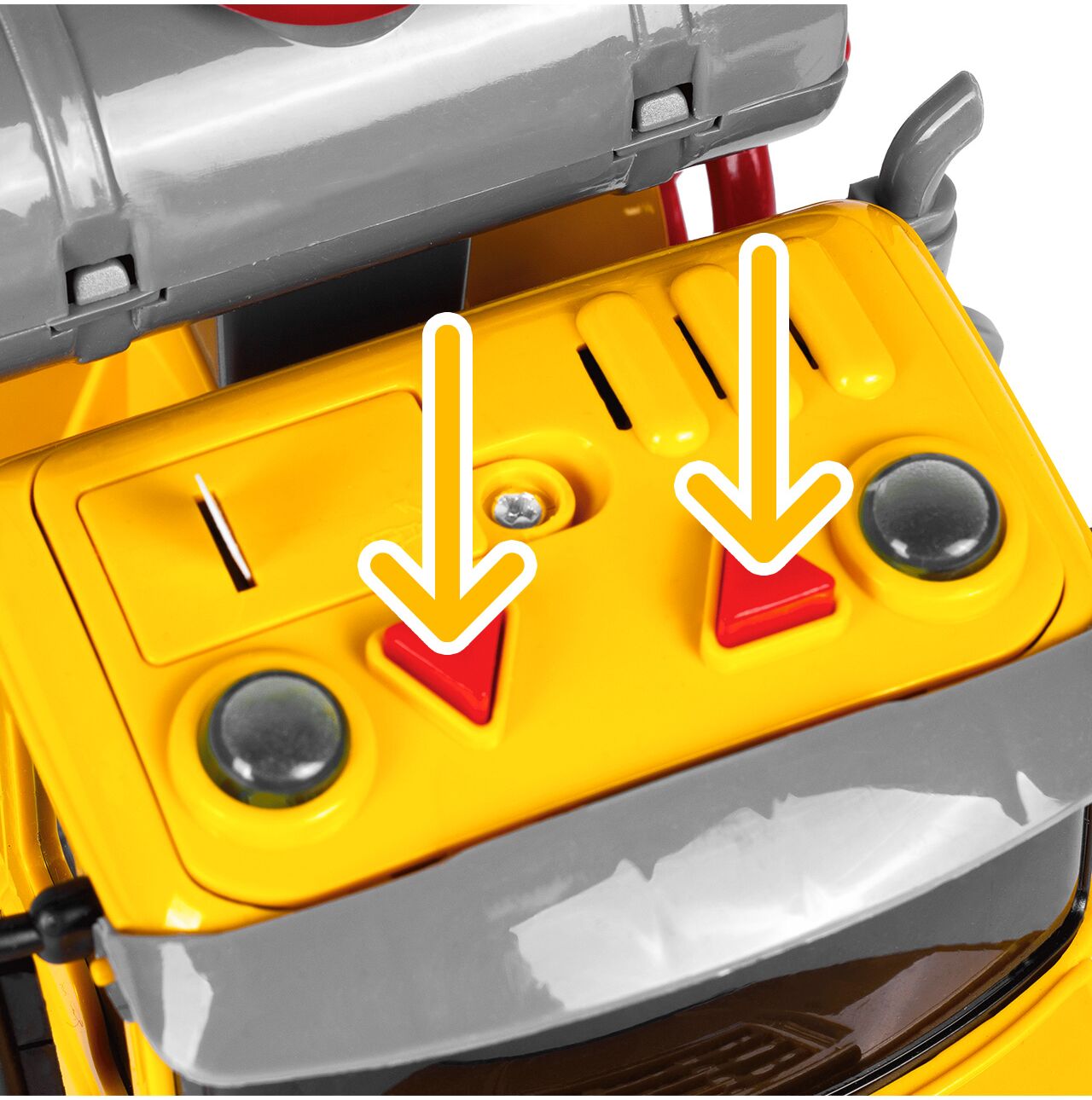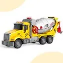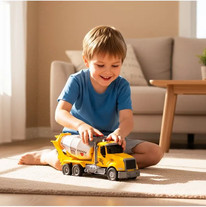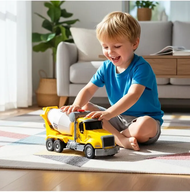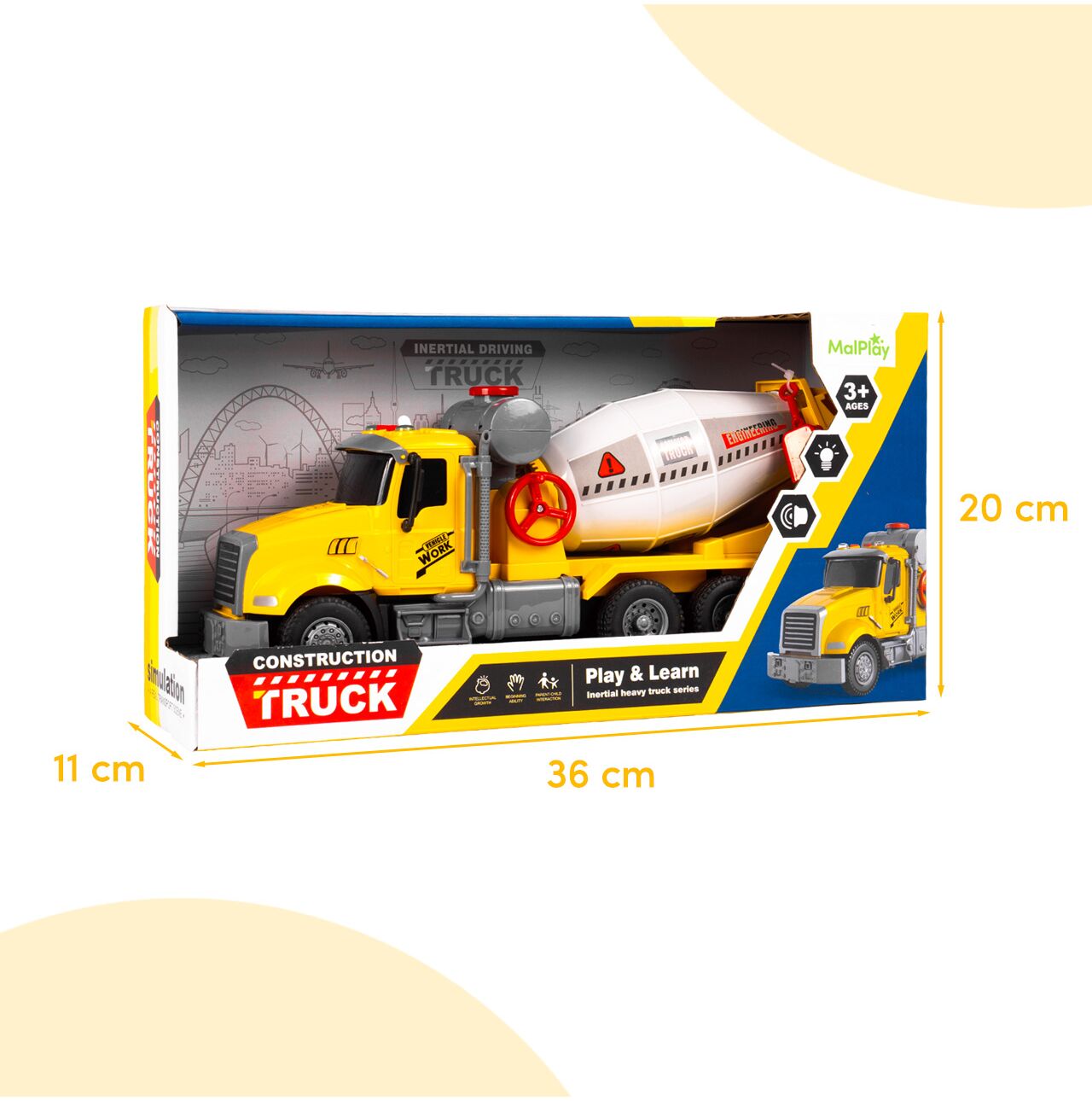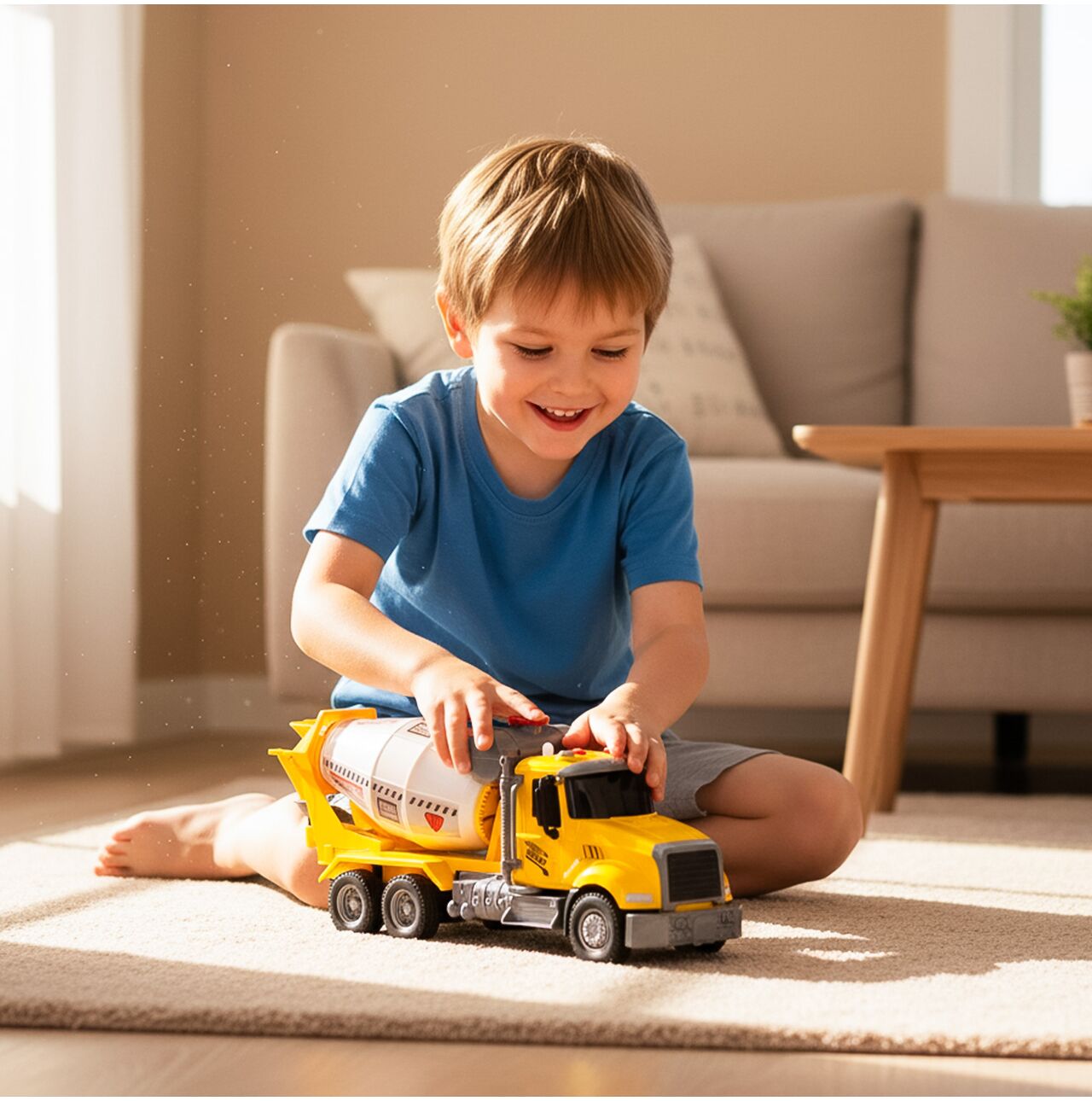 Hračka je navržena tak, aby připomínala skutečné stavební vozidlo. Buben míchačky na beton se otáčí knoflíkem a zadní násyp je pohyblivý , což umožňuje ještě více si prožít scény související se stavbou.Díky tomu dítě nejen řídí auto, ale také aktivně využívá jeho funkce.
