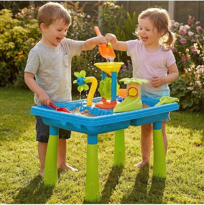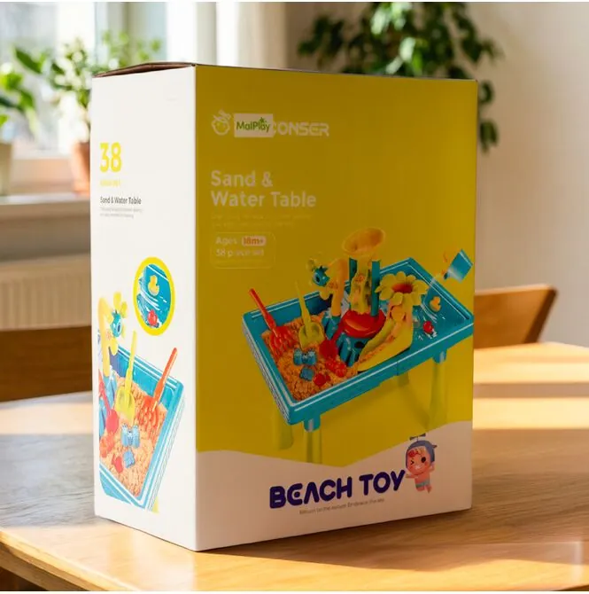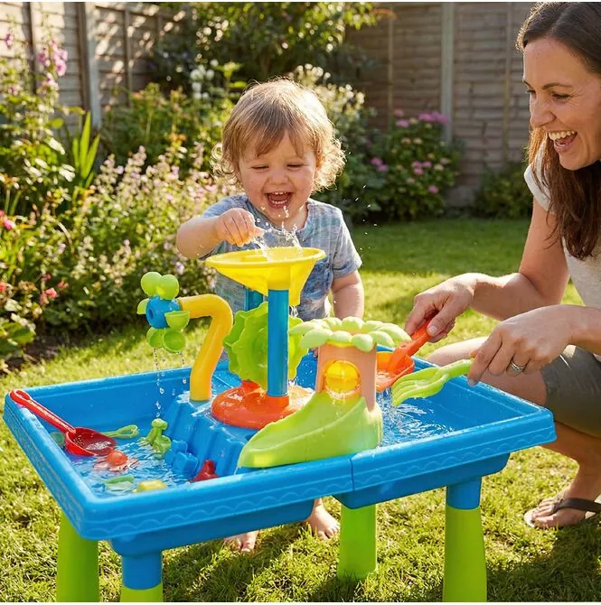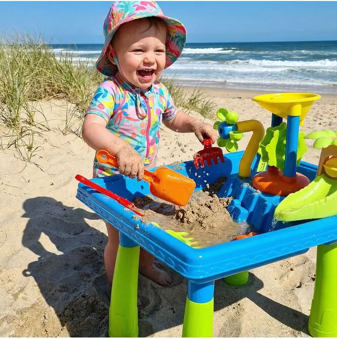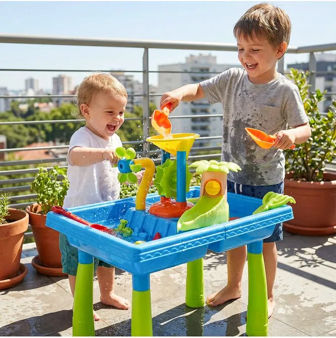 To nie jest zwykły stolik z akcesoriami, tylko małe centrum letniej zabawy. Dziecko może przelewać wodę, przesypywać piasek, obserwować ruch elementów i samodzielnie tworzyć własne scenariusze zabawy. Taki stolik daje mnóstwo radości i sprawia, że maluch chce wracać do niego każdego dnia.