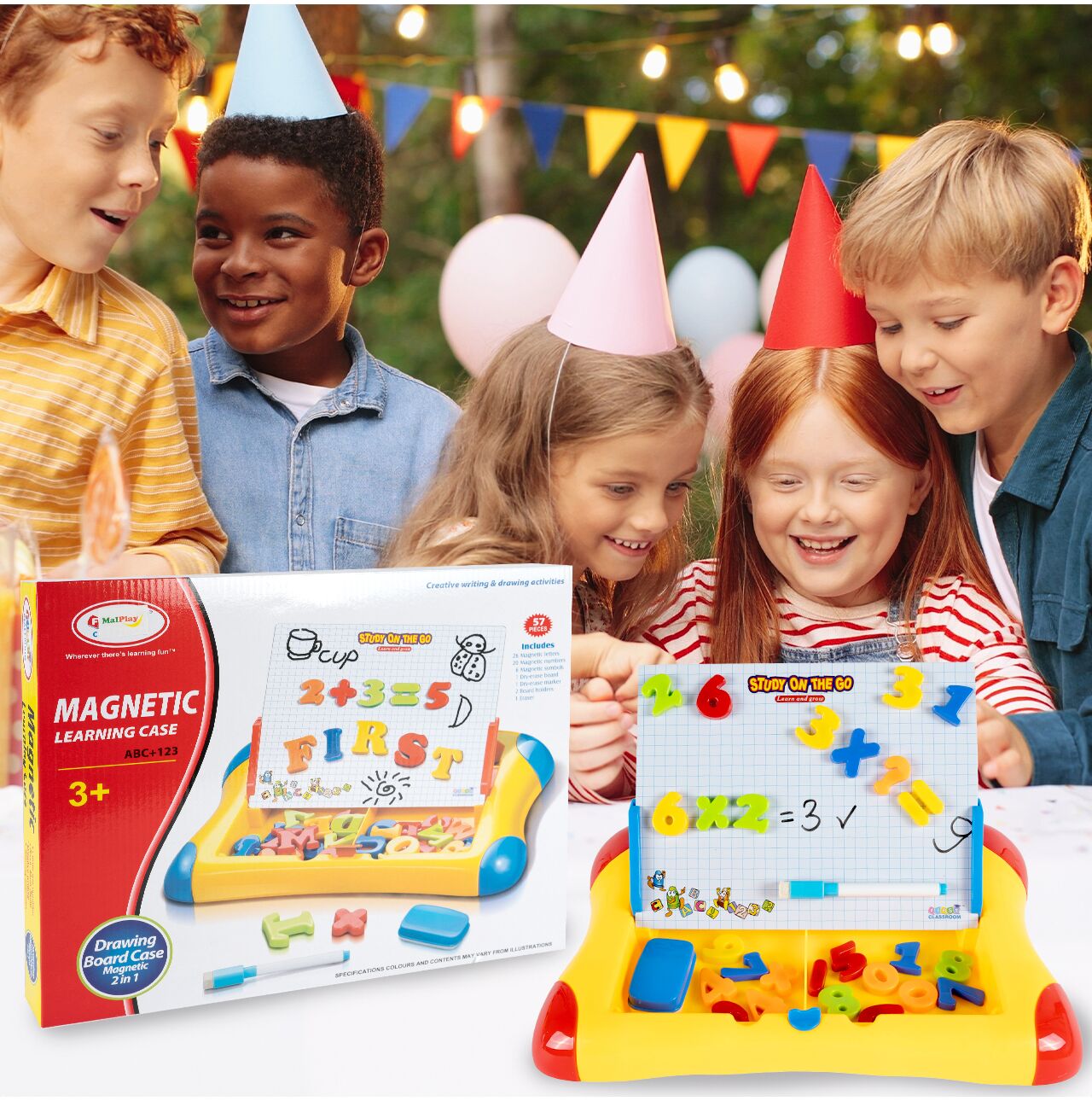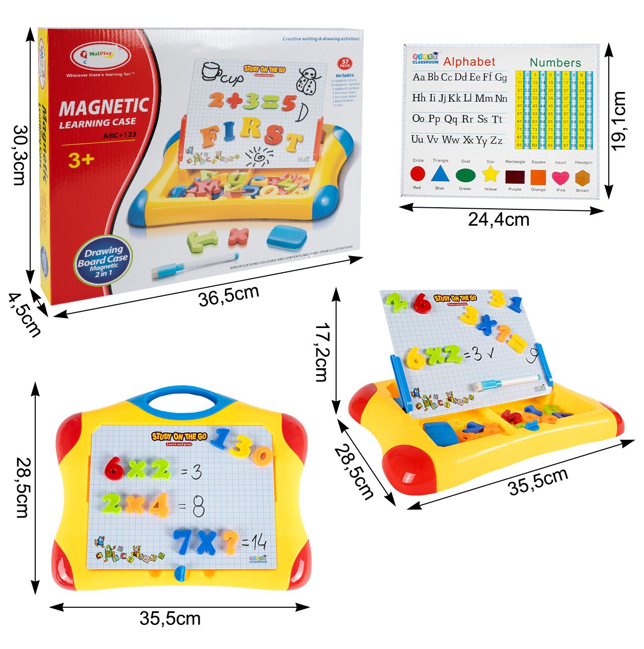 ZAWARTOŚĆ OPAKOWANIA:- 26 literek magnetycznych,- 20 cyferek magnetycznych,- 6 symboli matematycznych,- 1 tablica suchościeralna,- 1 marker do tablic suchościeralnych,- gąbeczka,- obudowa