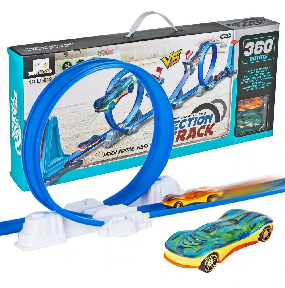 Tor samochodowy z dwiema pętlami, wyrzutnią oraz autkami będzie idealnym prezentem dla każdego małego fana wyścigów i motoryzacji.