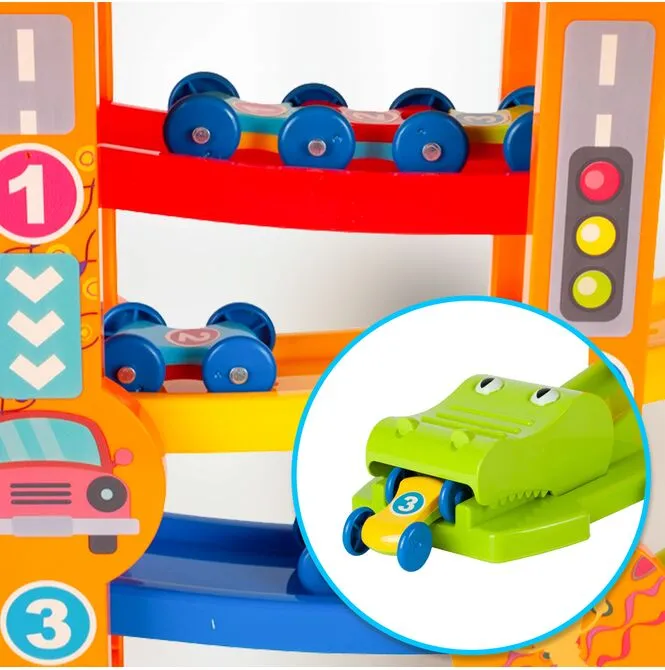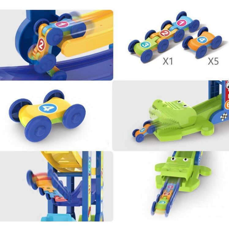 Autko puszczone w ruch na samej górze zjeżdża na sam dół pokonując wszystkie 5 poziomów i na samym dole wyskakuje z wyrzutni otwierając przy tym paszczę krokodyla.