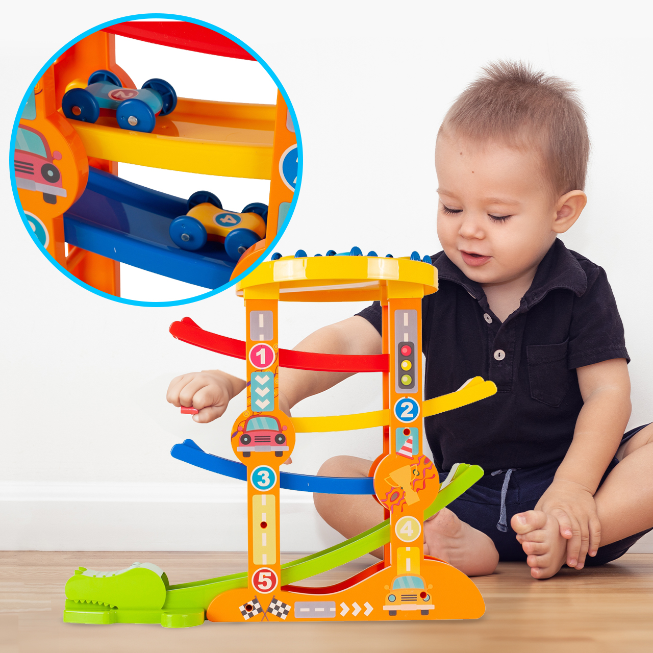 Nummerierte Level und nummerierte Autos helfen dabei, Reihenfolgen, Zahlen und Ordnung zu vermitteln. Kinder lernen außerdem Ursache-Wirkungs-Zusammenhänge kennen, indem sie die Bewegung der Autos auf der Strecke beobachten.