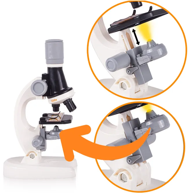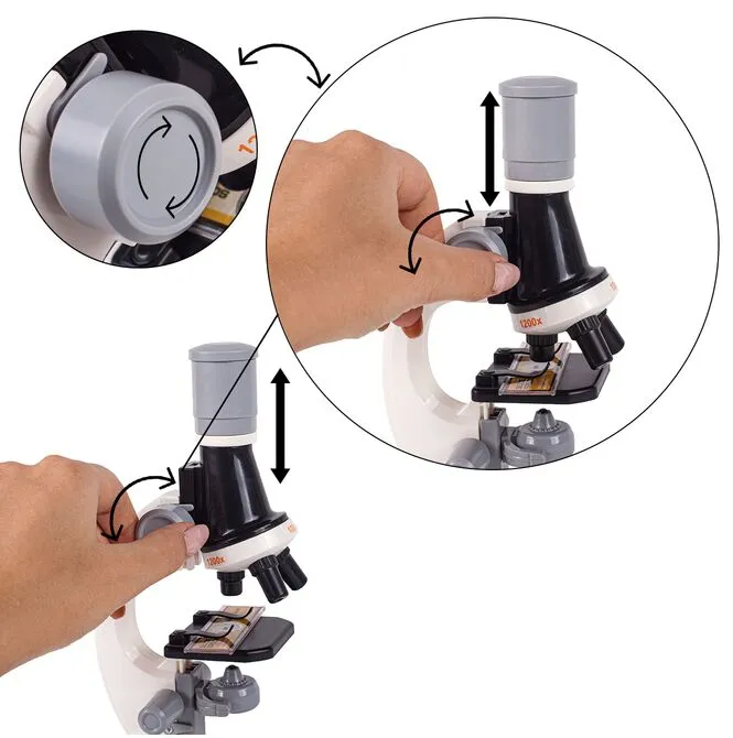 Velký a pohodlný knoflík pomáhá dětem zaostřit obraz a nastavitelná výška stolu jim umožňuje nastavit perfektní vzdálenost od objektivu. To učí přesnosti a trpělivosti.