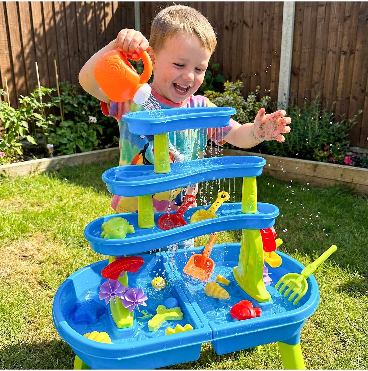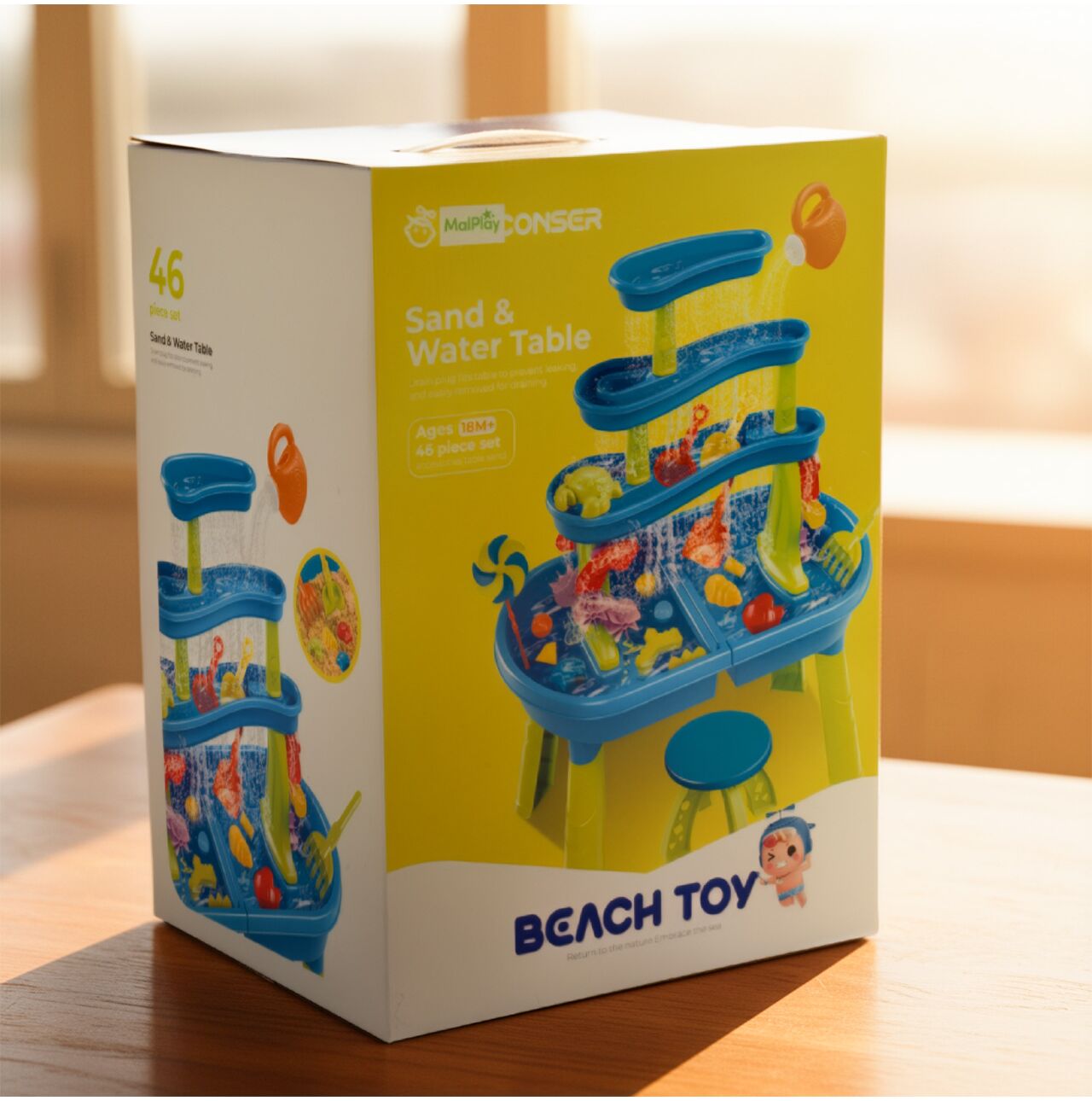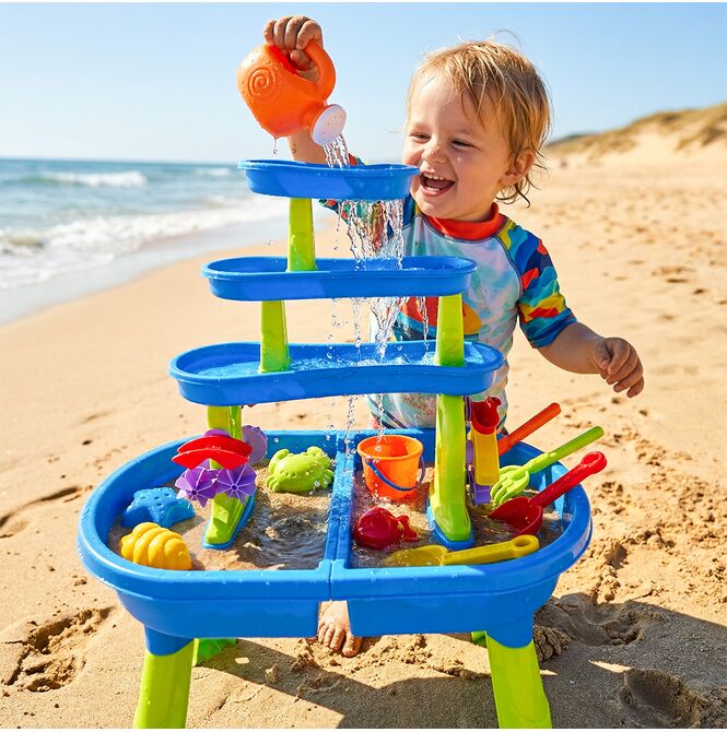 Tato sada je navržena tak, aby dětem nabídla různé herní zážitky. Jednoduše nalijte vodu do horní části a sledujte, jak stéká po patrech, čímž uvedete živly do pohybu a vytvoříte vzrušující vodní cestu. K dispozici je také možnost hrát si s pískem, formičkami, lopatkami a dalším příslušenstvím. Děti mohou nalévat vodu konví, sypat písek, chytat ryby, nabírat a stavět – přičemž každá aktivita vypadá jinak.