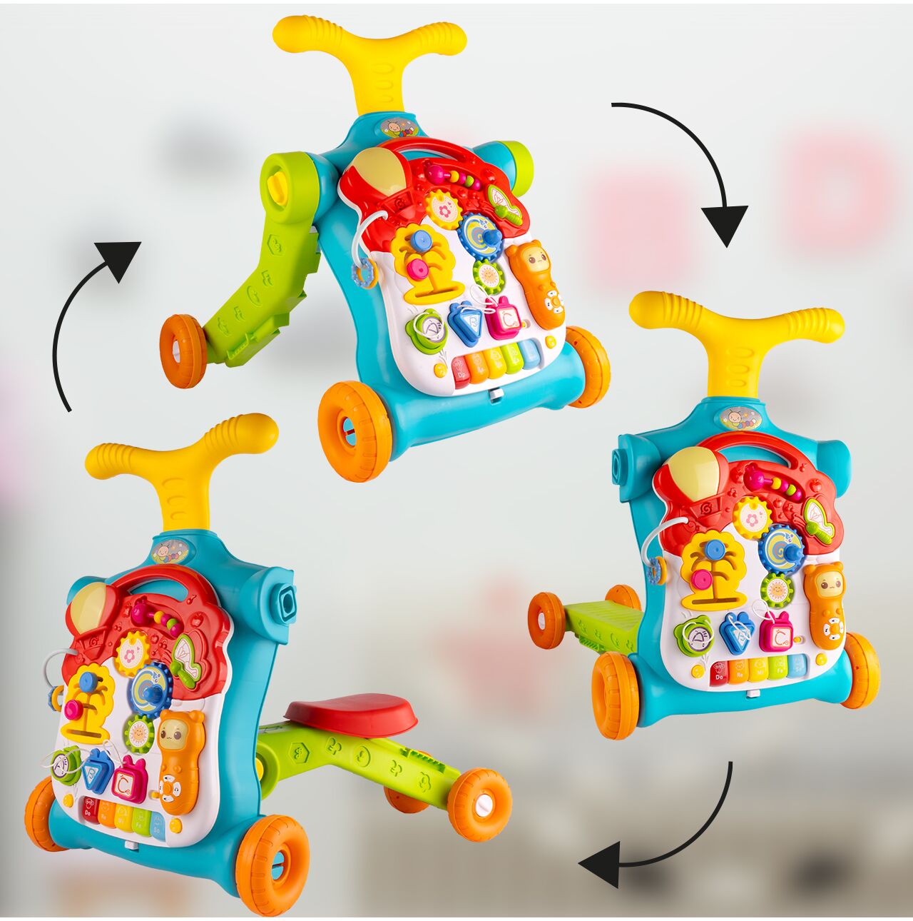 - přeměna odstrkovadla na výukový stůl, koloběžku, kolo a samostatný hrací panel