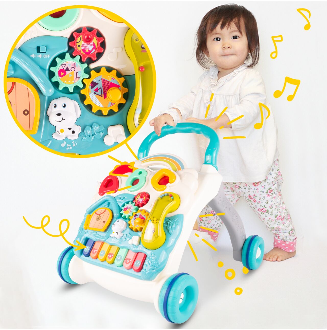 Chodítko má 7-klávesové piano , které vám umožní naučit se zvuky a první melodie.