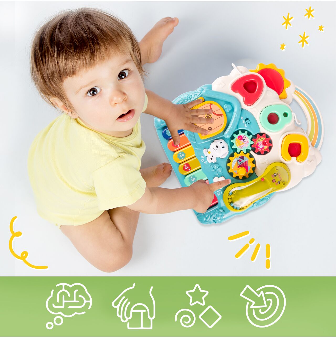 Interaktivní panel je vybaven odnímatelnou hračkou ve tvaru telefonu, která funguje jako chrastítko. Díky tomu si s ní může batole hrát samostatně, rozvíjí se manuální dovednosti a motorická koordinace.