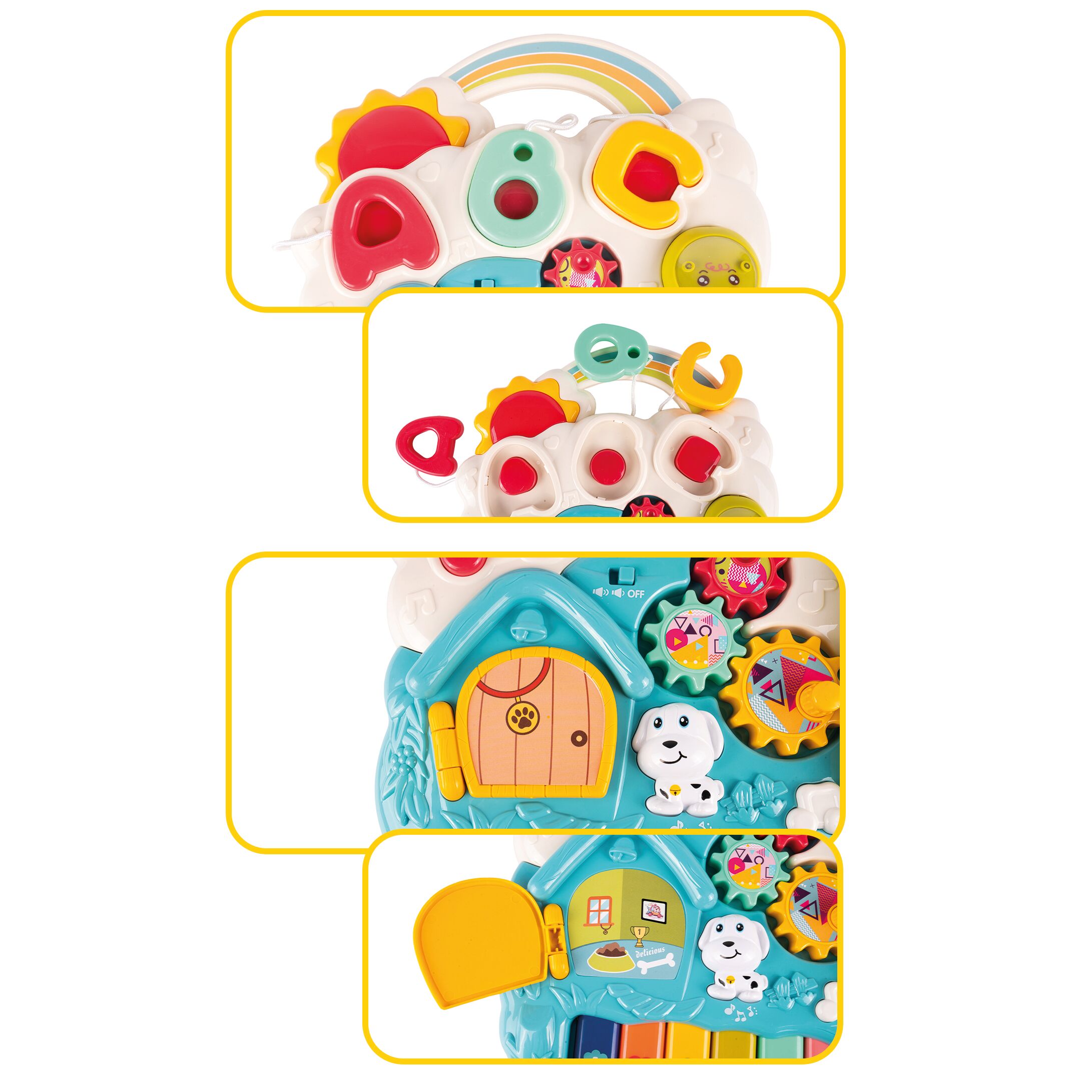 Interaktivní panel je vybaven půvabnými dvířky, které může vaše dítě otevírat a zavírat a objevovat skrytá překvapení. Při hraní si vaše batole procvičuje koordinaci rukou a očí, rozvíjí motorické dovednosti a učí se příčině a následku. Veselý pejsek a barevná grafika za dvířky dítě navíc zaujmou a poskytují mu radost z objevování nových prvků hračky.