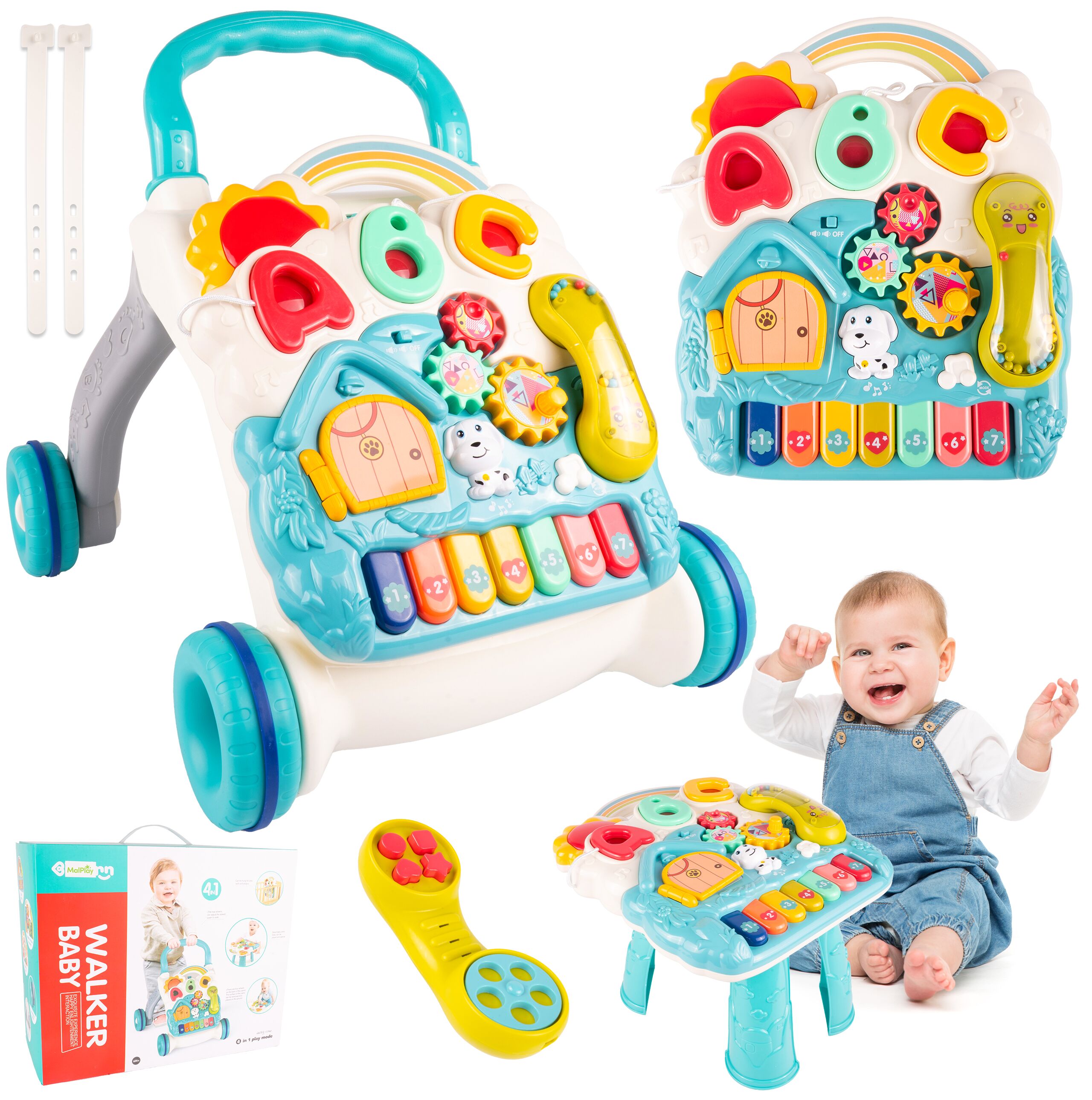 - 4v1 - multifunkční hračka : odstrkovadlo, výukový stůl, klavír a třídička tvarů