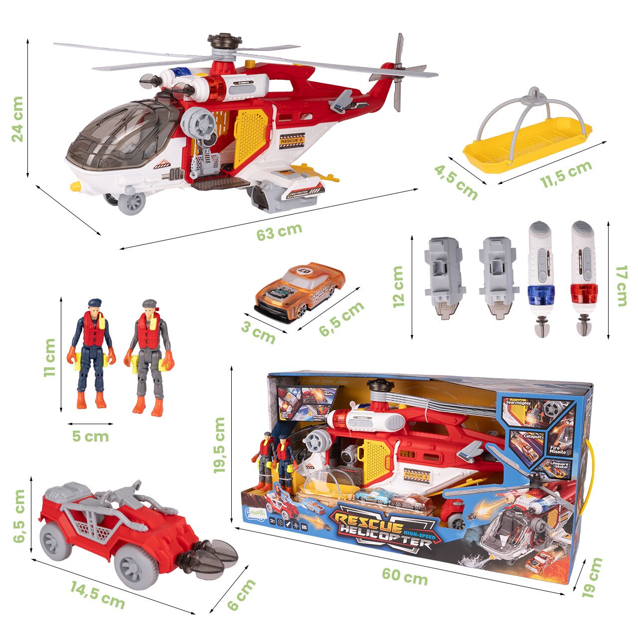 Vrtulník má otevírací sekce a nákladový prostor. Kola usnadňují pojíždění a boční úchyty umožňují připevnění háku nebo koše. Je to pozvánka ke hře na logistiku: naložení, zajištění, start – stejně jako v reálných záchranných službách.