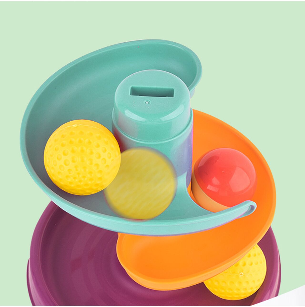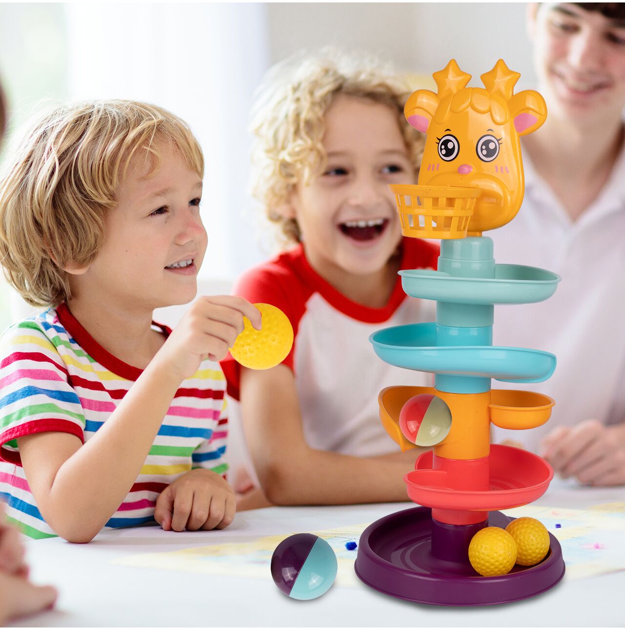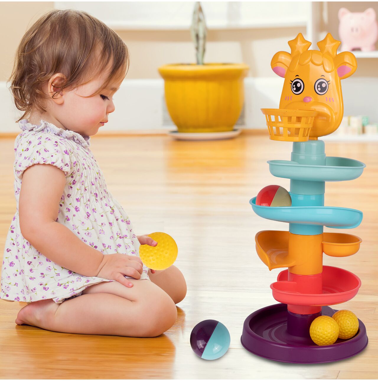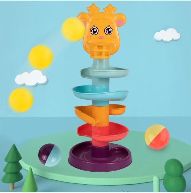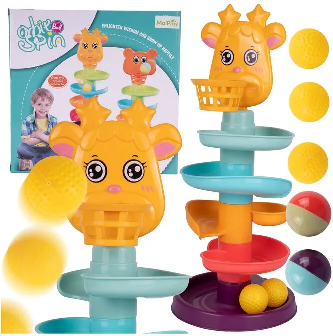 Úplne hore na šmykľavke je košík a hlava milého zvieratka - žirafy. Dieťa môže hádzať loptičky do koša a sledovať, ako sa kotúľajú po šmykľavke. Vďaka tomu sa batoľa učí presnosti a koordinácii ruka-oko.